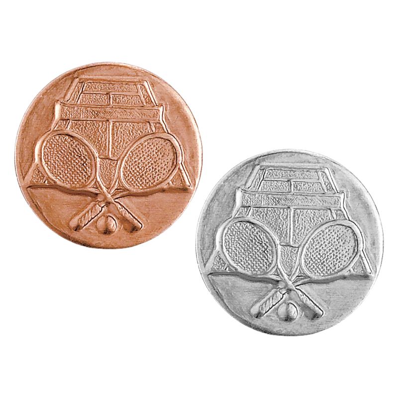The image stamped into this 1-inch medallion insert depicts a pair of crossed tennis rackets above a tennis ball and court. The medallion can be fitted into any insert of the same size, and is available in gold, silver, or bronze. The disc is made of brass, has a diameter of 1 Inch, and measures 1.4mm/0.055 inches in thickness.
