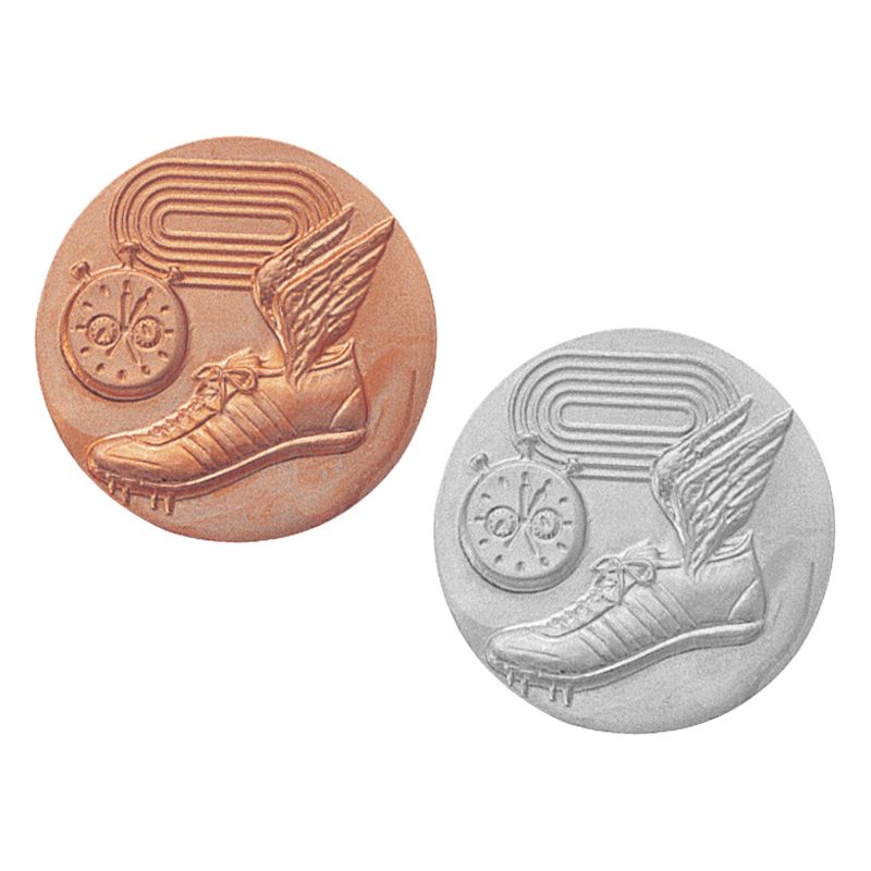 The image stamped into this 1-inch medallion insert depicts a winged track shoe, a stopwatch, and a top-down view of a running track. The medallion can be fitted into any insert of the same size, and is available in gold, silver, or bronze. The disc is made of brass, has a diameter of 1 Inch, and measures 1.4mm/0.055 inches in thickness.