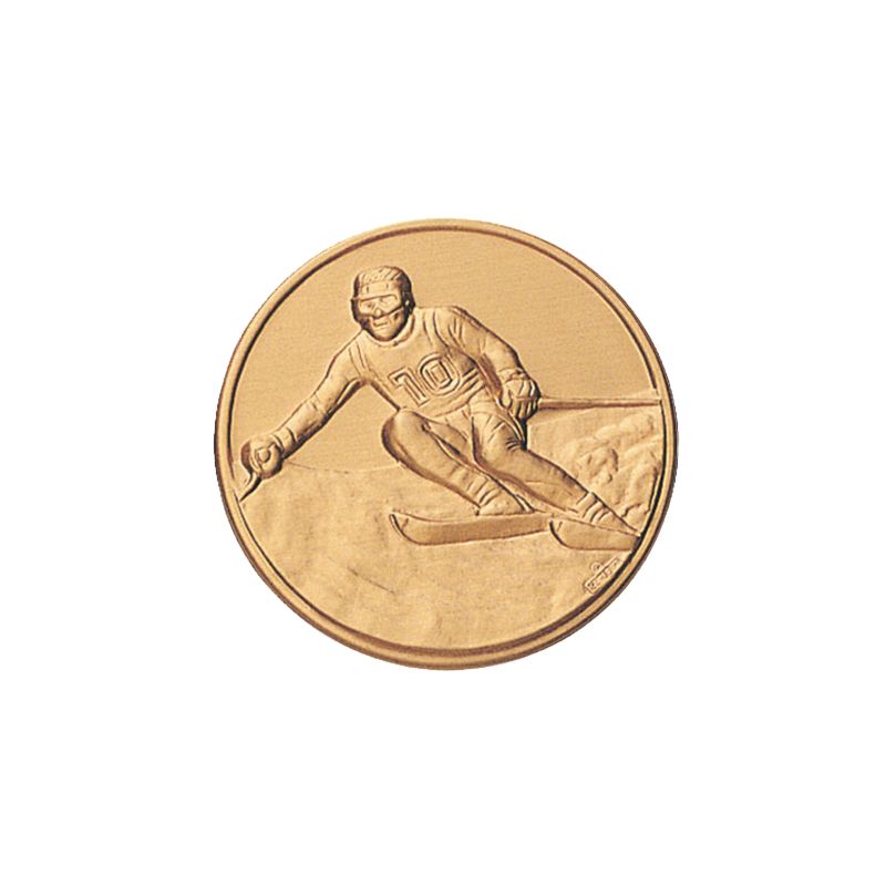 A stamped image of a male athlete skiing down a snowy slope adorns this 1-inch medallion insert disc, and it is available in gold, silver, or bronze. The disc is made of brass, has a diameter of 1 Inch, and measures 1.4mm/0.055 inches in thickness.