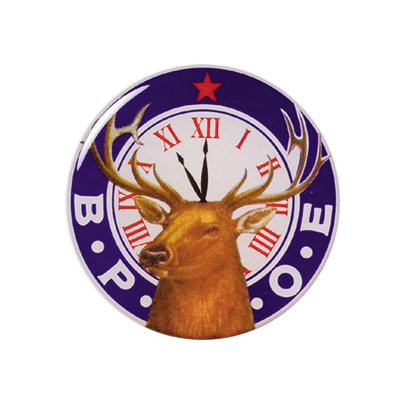 This 2-inch in diameter mylar insert has a clean B.P.O.E. emblem on its front depicting an elk above a clock of roman numerals. The imagery is protected by a clear epoxy dome on its front, while the back comes with a peel-and-stick adhesive for application.