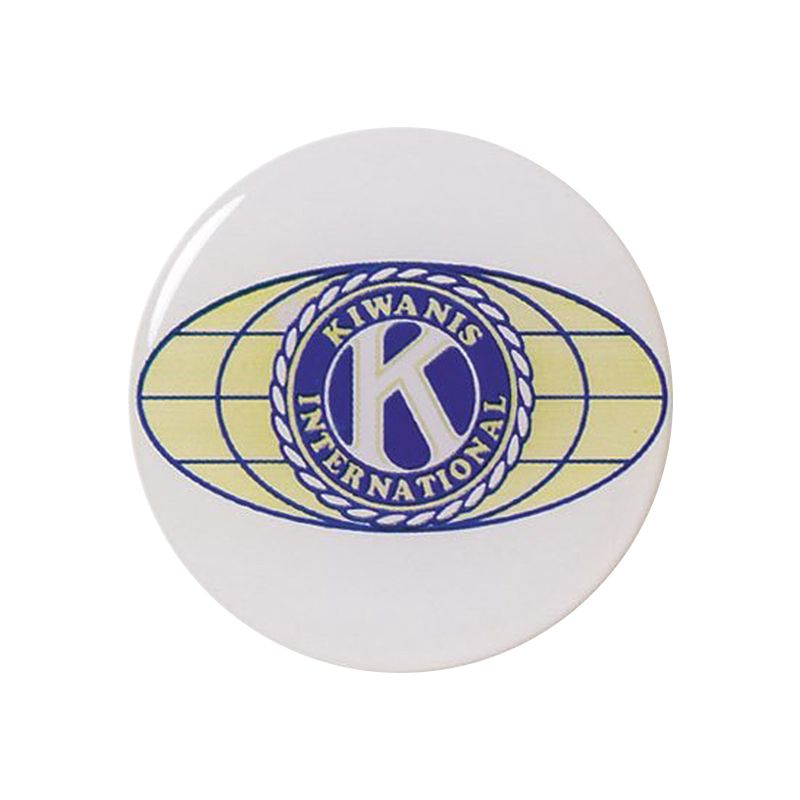 A mylar image of the Kiwanis International emblem over a white background is shielded by a clear epoxy dome on the front of this insert, complementing and protecting the colors of the underlying imagery. This insert is 2 inches in diameter, and has a peel-and-stick backside to allow it to be easily fitted.