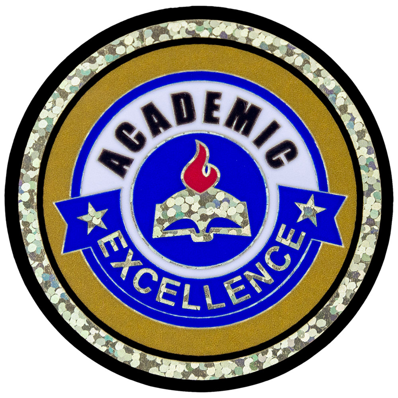 Printed onto the front of this 2 inch in diameter gold insert is a multicolored Mylar image of a an academic excellence emblem in gold, blue, and white. The emblem depicts an open book inside a blue and white roundel with 'Academic Excellence' printed radially around it.
