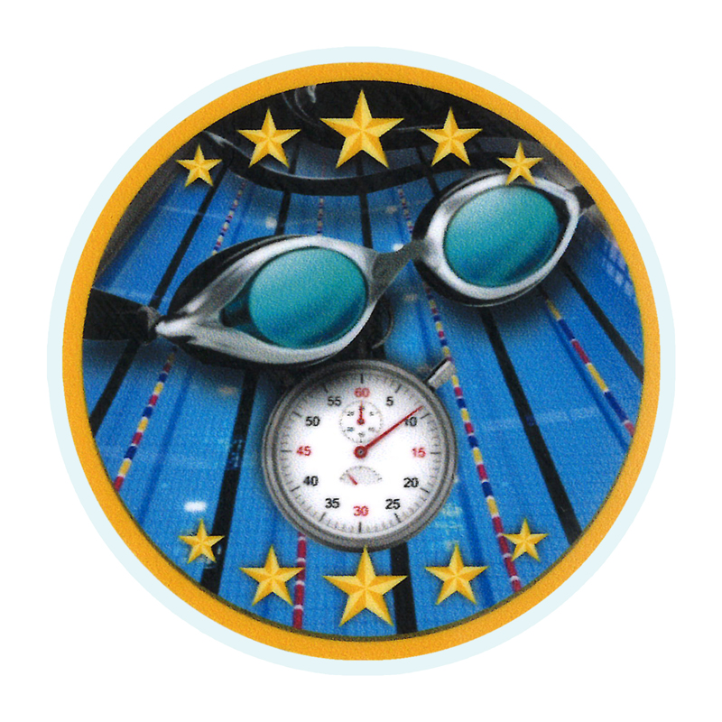 The front face of this swimming insert is adorned with a detailed colored Mylar image depicting a large multi-laned swimming pool with a pair of goggles and a stop watch above it, as well as numerous gold stars at the top and bottom of the image.The insert has a 2 inch diameter.