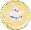 The front of this 2 inch in diameter gold insert has a Mylar image of a silver star wrapped in a banner that reads 'Most Improved', and a golden laurel wreath that lines the inserts border.