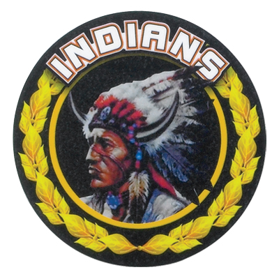On the front of this sports insert variant is a detailed image of an American Indian in an ornate headdress, encompassed by a golden laurel wreath titled at the top with a bold: 'Indians'. The insert is 2 inches in diameter.
