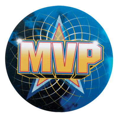 On a black and blue background, a gold star with 'MVP' written over it in gold Mylar details the front of this 2 inch in diameter insert disc. It can be fitted to any insert slot of the same size.
