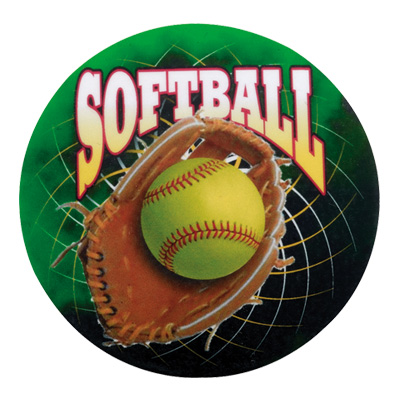 The front face of this insert disc is decorated with a multicolor Mylar image of a softball mitt with a ball in it over a green and black background, and benath gold text that reads: 'Softball'. The disc has a diameter of 2 inches.