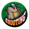 A Mylar image of a person aiming a firearm over a green and black background have been printed onto the front of this insert disc; gold text underneath reads: 'Shooting'. The disc has a diameter of 2 inches and can be fitted into any insert slot of the same size.