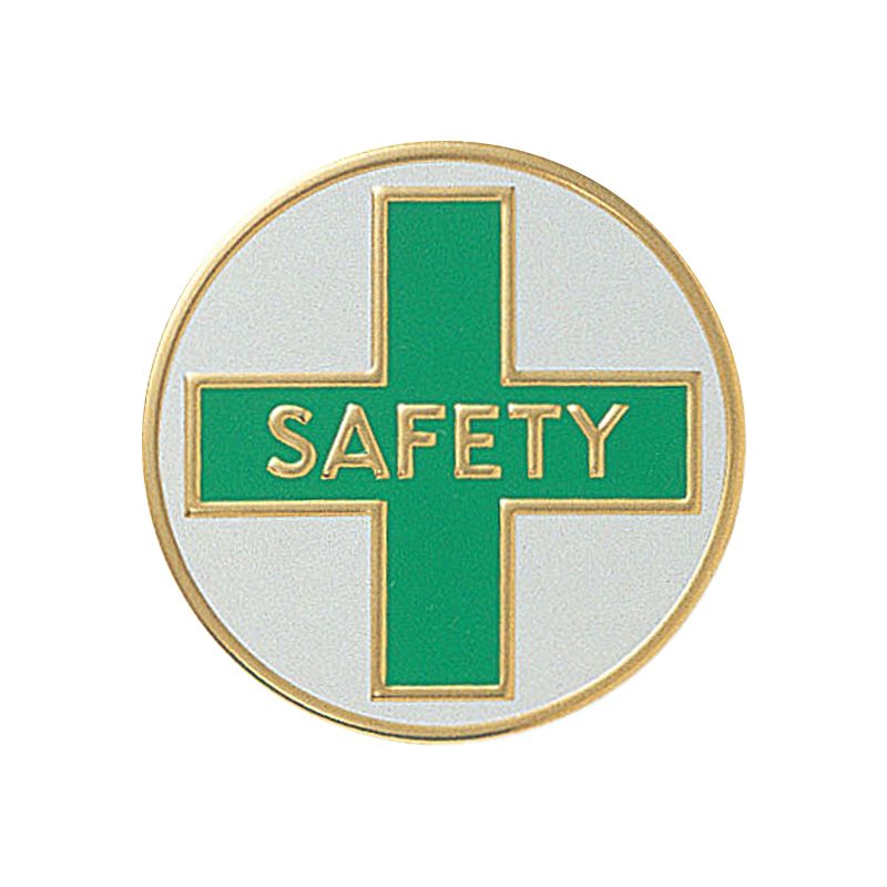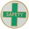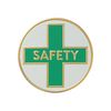 On this 2 inch in diameter enameled metal medallion insert is a litho-print image of a green medical cross over a white background with 'Safety' printed across the medallions center. While the medallion is brass, it bears a clean golden look where there is no litho-print.