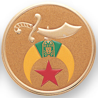The Shriner inspired 2 inch in diameter enameled metal medallion pictured above is etched with a multicolored image of a gold scimitar over a moon and star. This charming golden medallion is made of gold-aluminum, has a diameter of 2 inches, and measures 1.4mm/0.055 inches in thickness.