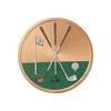 The front of this gold insert disc has a detailed Mylar image of a trio of golf club and putters on a golf course. This 1.4mm/0.055in thick disc has a gold-aluminum body, is 2 inches in diameter, and a peel-and-stick back to allow it to be fitted to any insert of its size.
