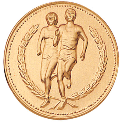 This variant of 2 inch in diameter insert disc has a front face stamped image of a duo of runners jogging through a laurel wreath. The disc is all metal, and comes available in gold, silver, or bronze.