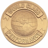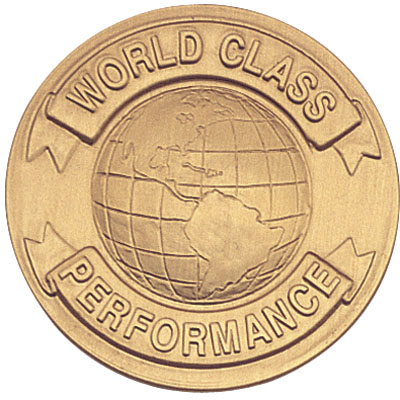 Surrounding a detailed globe is a set of stamped banners titled: 'World Class Performance'. The disc is available in gold only, and can be fitted into any circular insert slot of the same size.