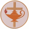 This variant of 2 inch in diameter insert medallion is etched on its front with an image of a lit lamp over a cross, with gold enameled detailing. The back of the medallion has a peel-and-stick feature for easy application, and can be fitted into any circular insert slot of the same size.