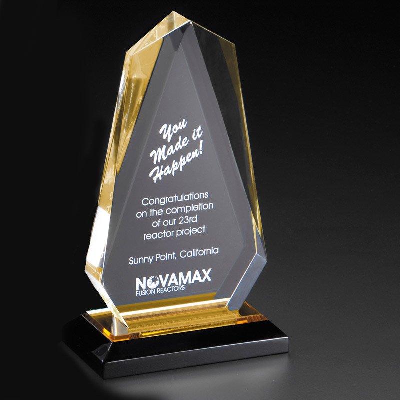 Item Description: 4-1/2 x 7-3/4 inch clear and gold arrowhead acrylic tower award with reflective black base.