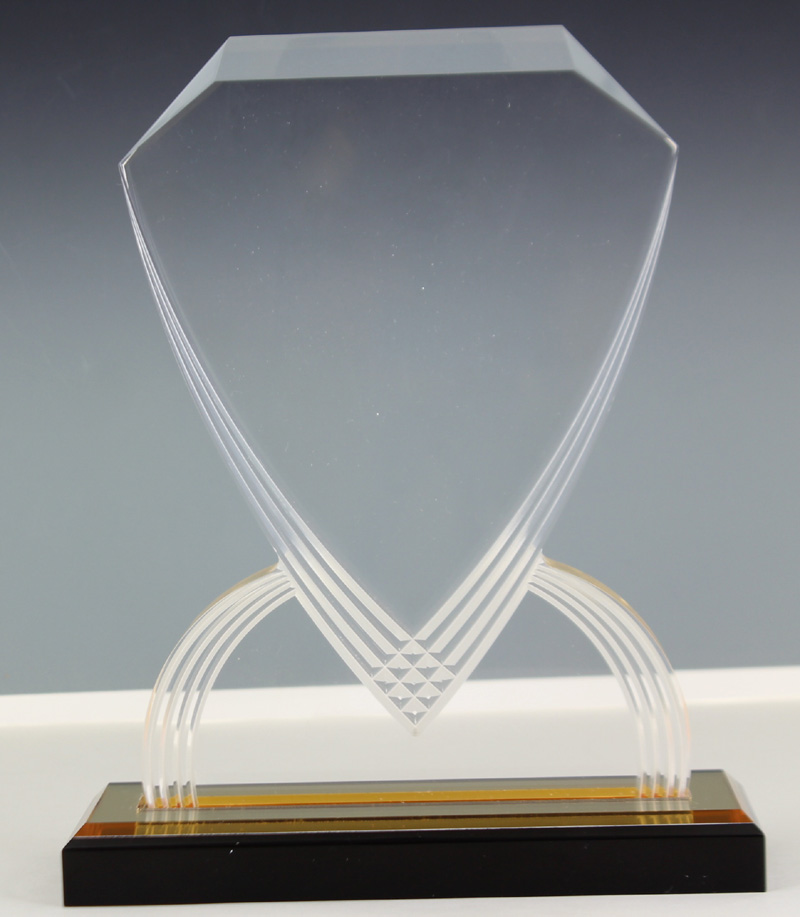 Item Description: 7-3/4 inch acrylic shield trophy. Reflective tinted gold black base with carved frosted edges. Size 7-3/4 inch height x 6 inch width.