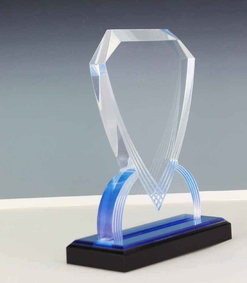 Item Description: 8-3/4 inch acrylic shield trophy. Reflective tinted blue black base with carved frosted edges. Size 8-3/4 inch height x 6 inch width.