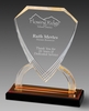 Item Description: 8-3/4 inch acrylic shield trophy. Reflective tinted gold black base with carved frosted edges. Size 8-3/4 inch height x 6 inch width.