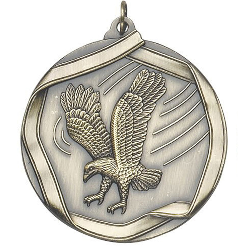 The frontside of this 2-1/4 inch 3D die-cast medal has an engraved image of a swooping eagle with its wings held high in flight, complete with a flowing banner border that encompasses the entire image along the edge of the medal. This is available in brass, pewter, or bronze, each with an antique finish, and the backside has room for custom engraving or imprinting.