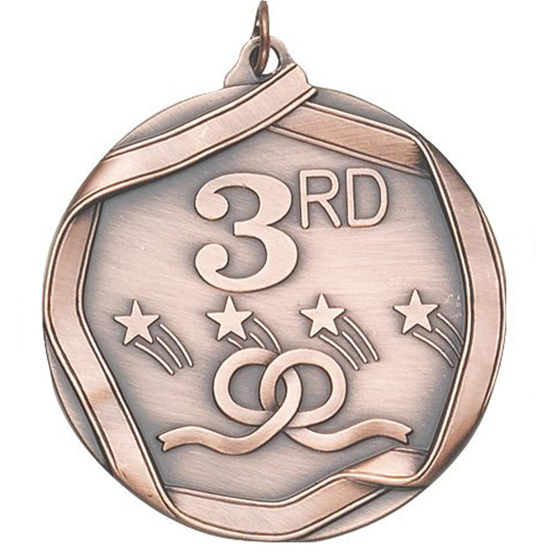 A large '3RD' above four stars and a looping ribbon are all engraved onto the front of this 2-1/4 inch 3D die-cast third place medal, complete with a flowing banner border that encompasses the whole image. This medal is available only in bronze with an antique finish, and the back has room for custom engraving or imprinting.