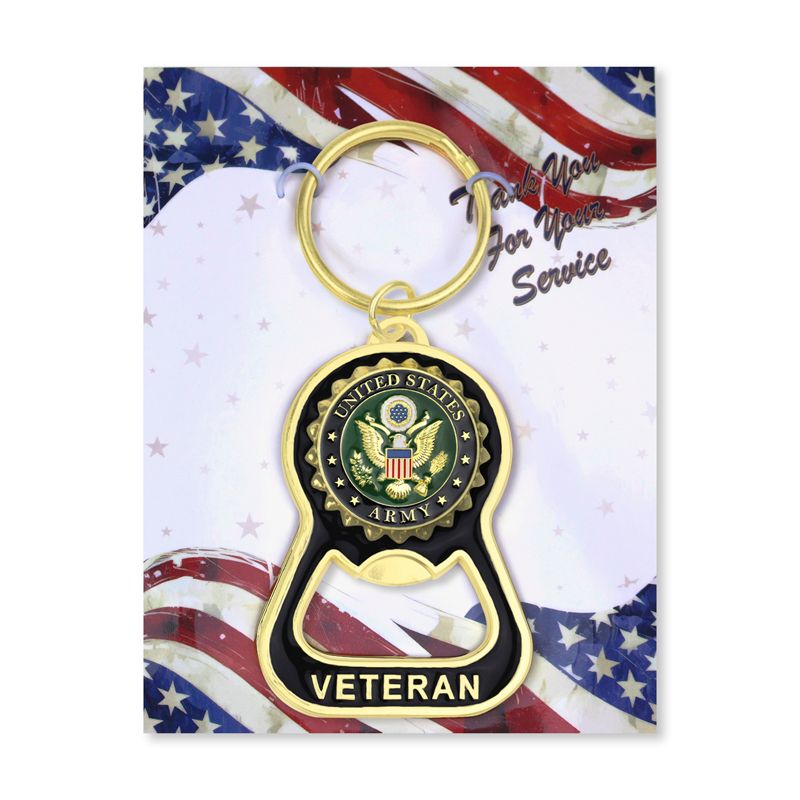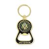 2-7/8 x 1-7/8 inch bright gold Army veteran bottle opener keychain. This bright gold rimmed keychain doubles as a bottle opener and features a soft epoxy enameled United States Army emblem with the word "Veteran" at the bottom with a black soft epoxy enamel interior. The back of the keychain is blank. Comes carded on a "Thank You For Your Service" American Flag card.