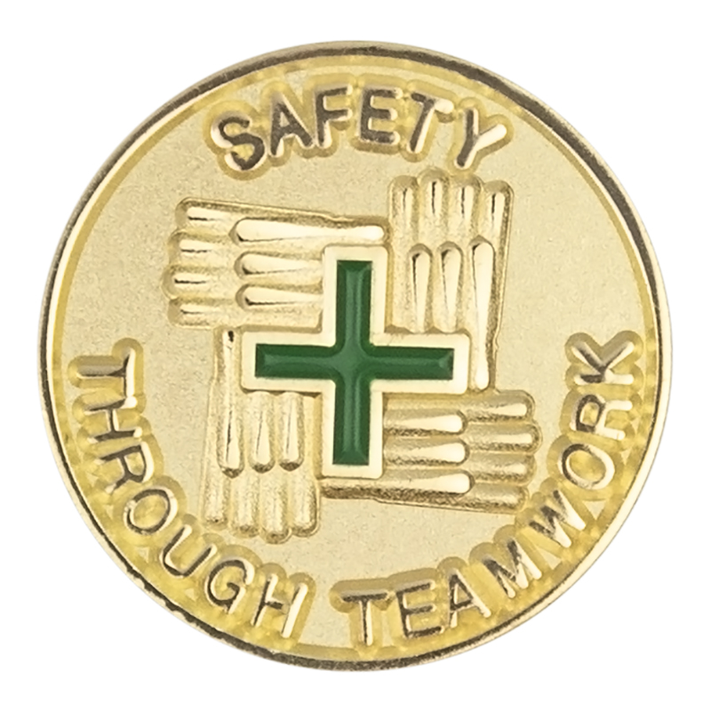 Item Description: Safety through Teamwork pin. Pin size is 3/4 inch, die struck enameled gold plated pin.