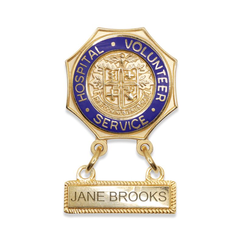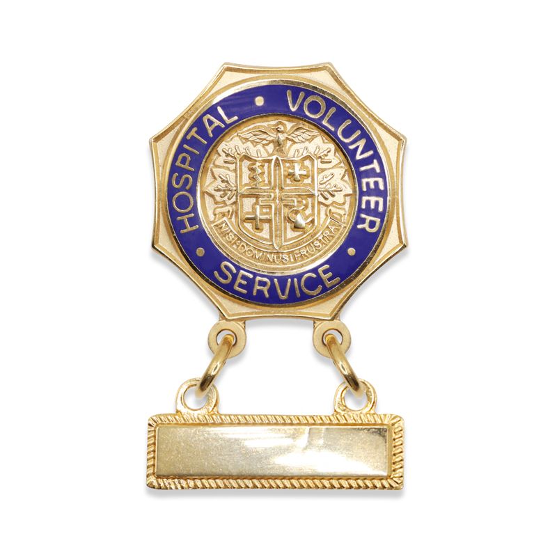 7/8 x 1-3/8 Inch brass Hospital Volunteer Service lapel pin with blue enamel and hanging bar that is blank for engraving. The center of the pin features a shield with a central Cross, an eagle atop and the Latin words "Nisi Dominus Frustra". The center is surrounded by a blue enameled ring that says "Hospital Volunteer Service". The blank bar may be inscribed with either a name or number of service hours, up to 10 characters. The back of the pin features a locking c clasp.