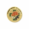 Item Description: 1 Inch "Commitment To Safety" die struck and satin finish gold lapel pin with butterfly clutch back. Design features a gold banner across the top that reads, "Commitment To Safety" and features an enameled hard hat and safety cross design in the center.