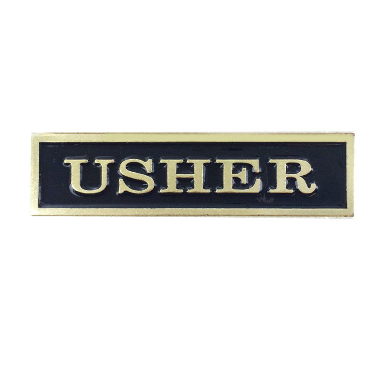Item Description: Die struck iron pin bright brass plated raised letters "USHER". Soft epoxy black enameled background and raised border. Size 1-3/4 inch length x 7/16 inch height.