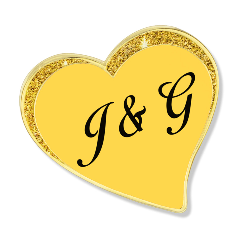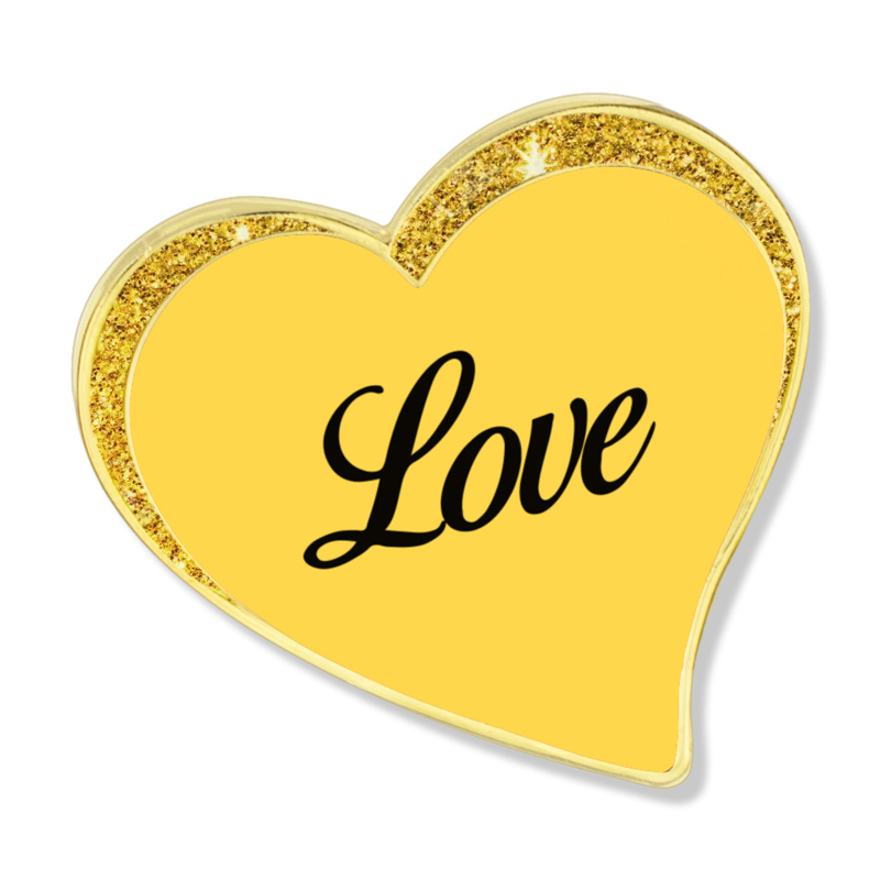Item Description: Modern yellow heart with gold sparkled border measuring 1 (width) x 1 (height) inch. Make is brass die struck with a soft enamel finish and a butterfly clutch back. Pin comes poly bagged.