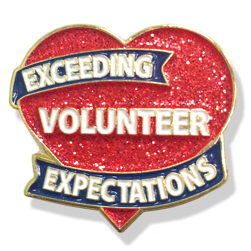 Item Description: Die struck enameled Exceeding Volunteer Expectations Sparkly Heart lapel pin with nail and military clutch back, poly bagged. Size is 1 inch (height) x 1-1/8 inch (width).