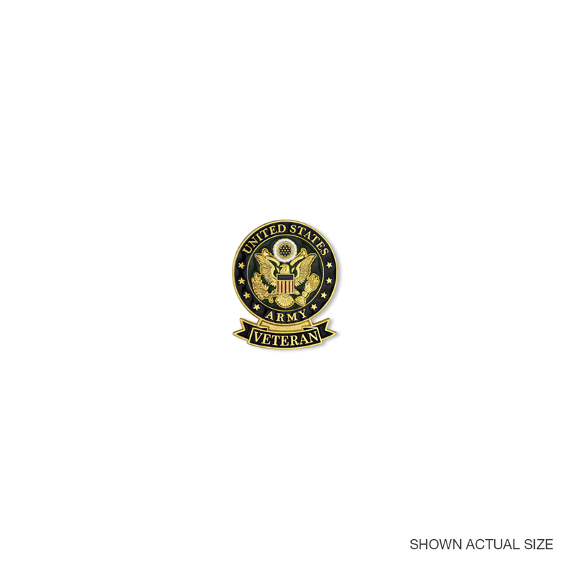 Item Description: U.S. Army symbol Veteran die struck hard stoned brass plated lapel pin. Size is 1-1/8 inches. Pin comes carded and attached to a patriotic American flag "Veteran" card.