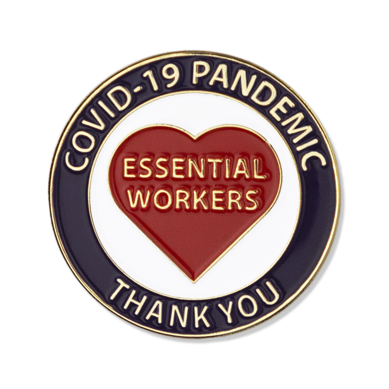 Item Description: 1-1/4 inch die struck and brass plated soft enameled epoxy Essential Workers Covid-19 Pandemic "Thank You" lapel pin with with butterfly clutch back.