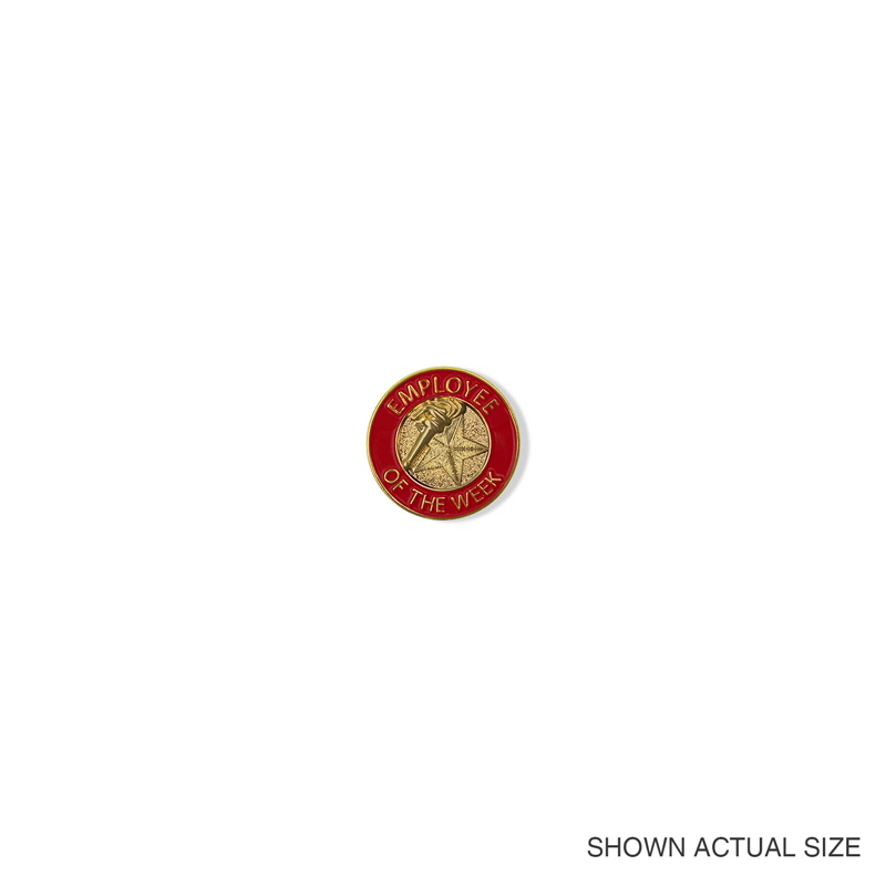 Item Description: Bright gold soft epoxy enameled red "Employee of the Week" pin. Make is brass die struck with a bright gold finish. Features a star and flaming torch design in the center and has a butterfly clutch back. Measures 7/8 inches in diameter. Pin comes polybagged.