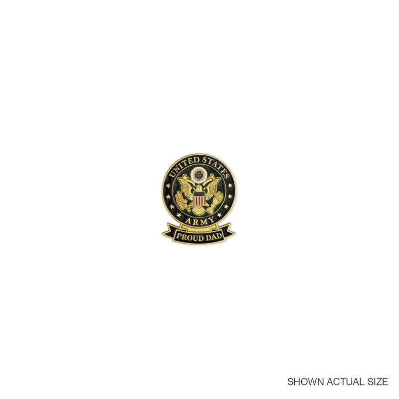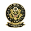 Item Description: U.S. Army symbol "Proud Dad" lapel pin with butterfly nail clutch backing. Make is brass die struck with a hard stone enamel and gold finish. Measuring 1-1/8 (height) x 7/16 (width) inches, this Army insignia parent pin comes carded and attached to a patriotic American flag "Proud Parent" card.