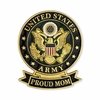 Item Description: U.S. Army symbol "Proud Mom" lapel pin with butterfly nail clutch backing. Make is brass die struck with a hard stone enamel and gold finish. Measuring 1-1/8 (height) x 7/16 (width) inches, this Army symol parent pin comes carded and attached to a patriotic American flag "Proud Parent" card.