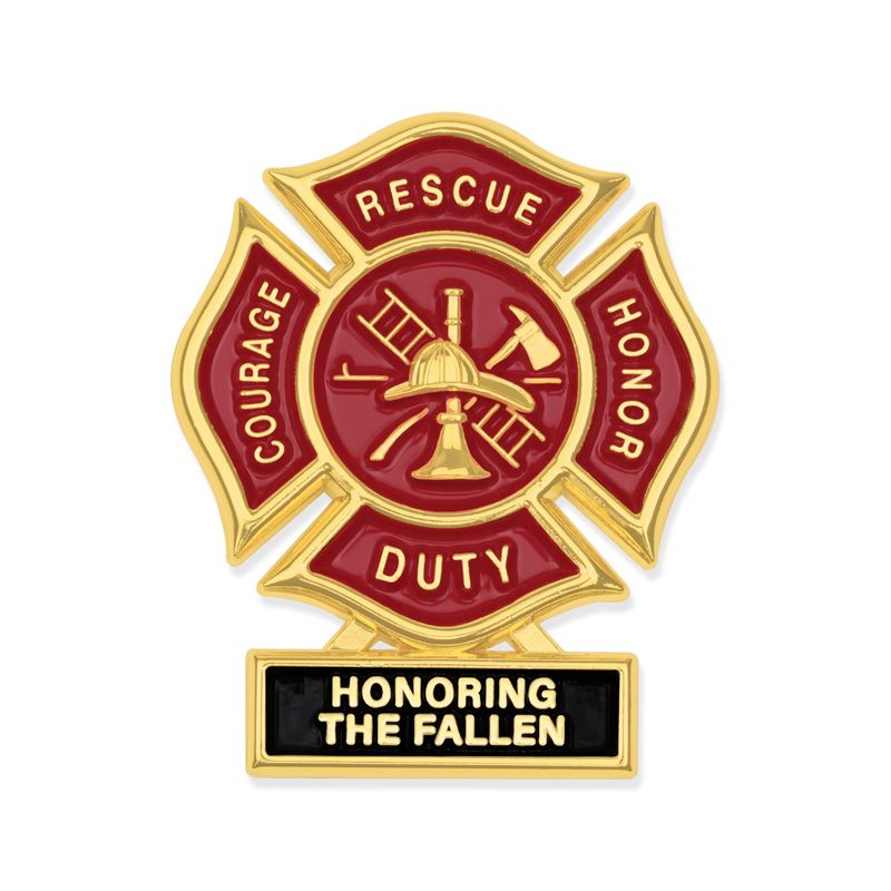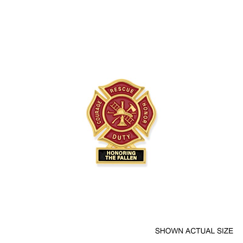 1-3/4 Inch Firefighter Maltese cross Fire shield lapel pin. Features the Maltese cross, a universal symbol of Firefighters and a badge of honor. Featuring the phrase "Honoring The Fallen" at the bottom. This bright gold pin has red soft epoxy enamel and a butterfly clutch back. The pin includes a "Thank You Fire Fighters For your Service" card.