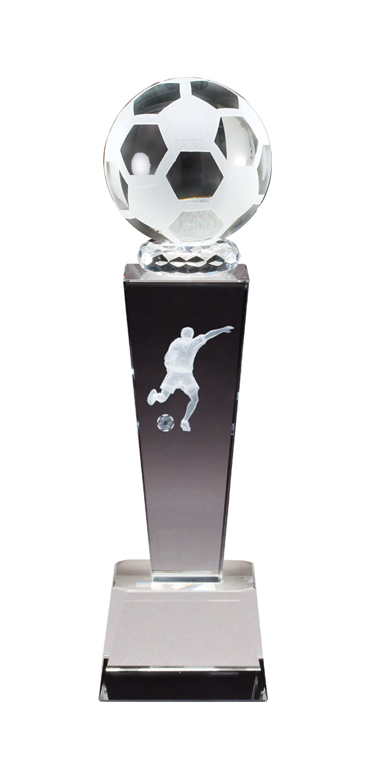 Item Description: Optical crystal soccer ball trophy with male figure laser engraved inside. Size 8 3/4 inch height and 2 1/2 inch width. Packaged in an elegant gift box.