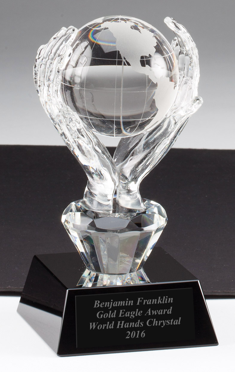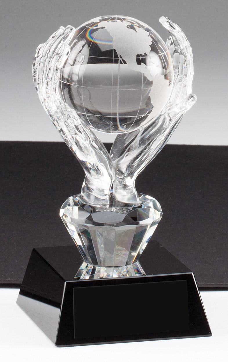 Item Description: 6 x 3 inch optical crystal hands holding globe trophy on black crystal base. Comes with black aluminum engraving plate.