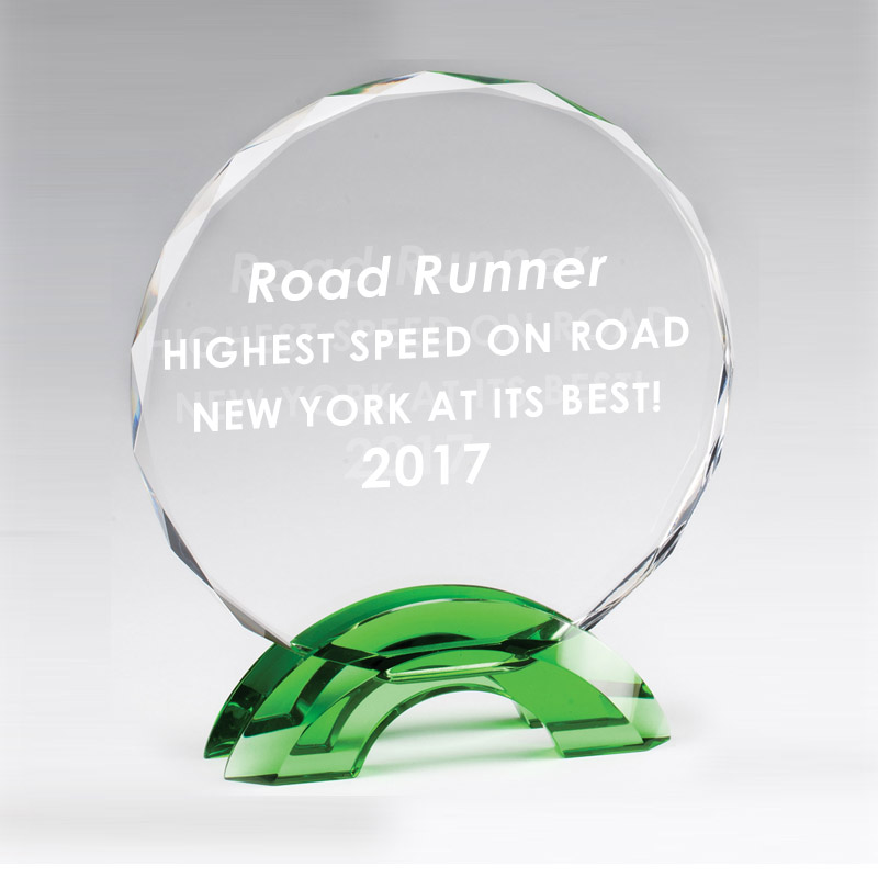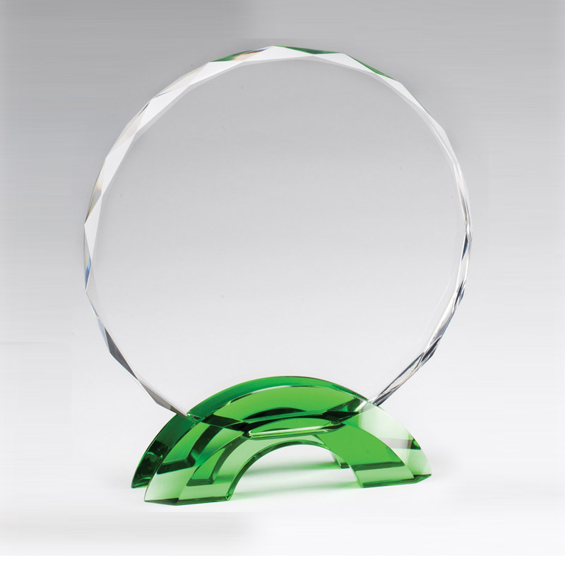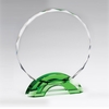 Item Description: 6-3/4 6 inch Green Double Arch Base with cut & beveled crystal circle award. This glass award comes with gift box.