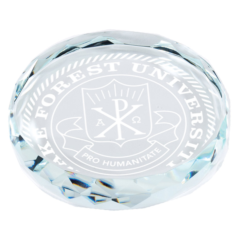 Item Description: 3" x 3/4" inch Crystal round paperweight cut & beveled edge. Comes with Gift box.
