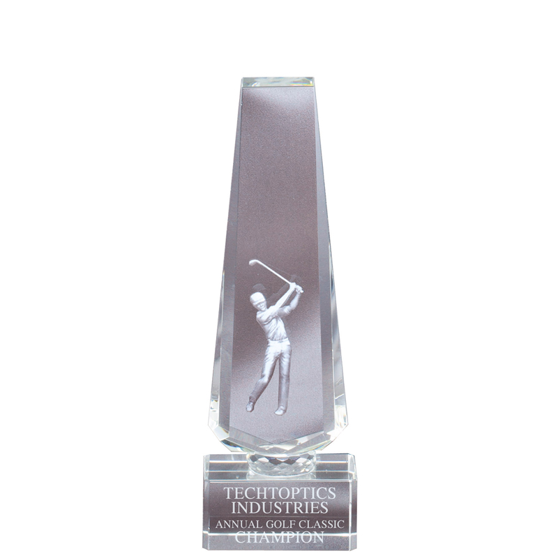 Item Description: Optical crystal Golf tower trophy, laser engraved male golfer inside. Size, 8" x 2-3/4". Can be delivered in Deluxe presentation box.