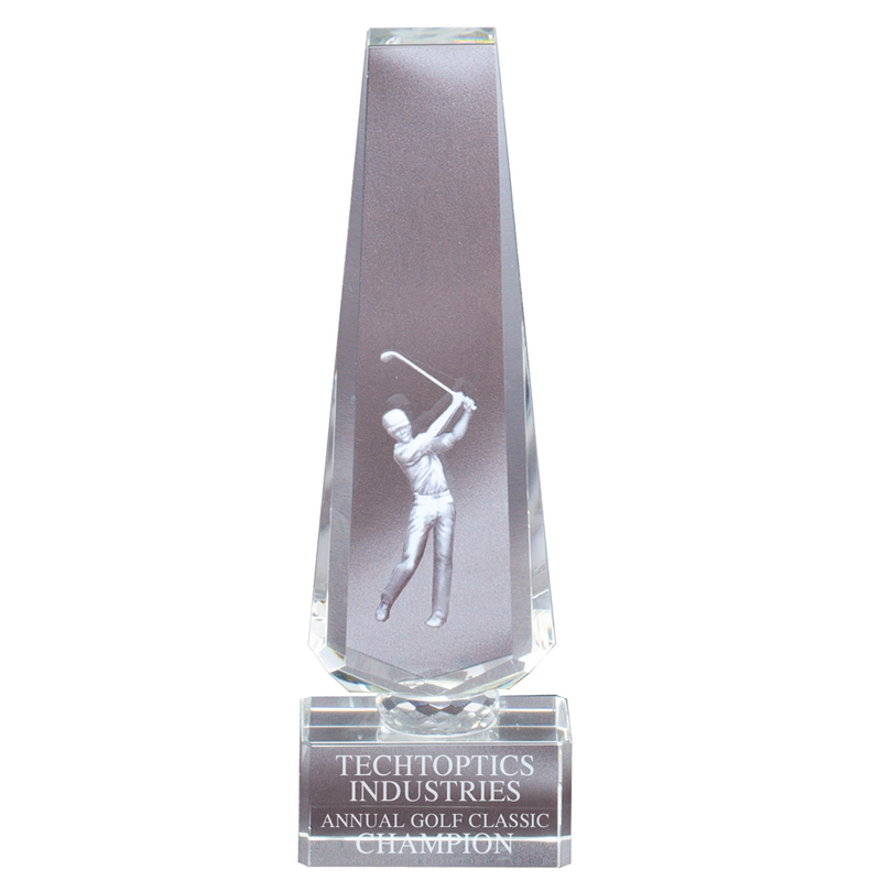 Item Description: Optical crystal Golf tower trophy, laser engraved male golfer inside. Size, 9-1/4 x 3". Can be delivered Deluxe presentation box.