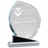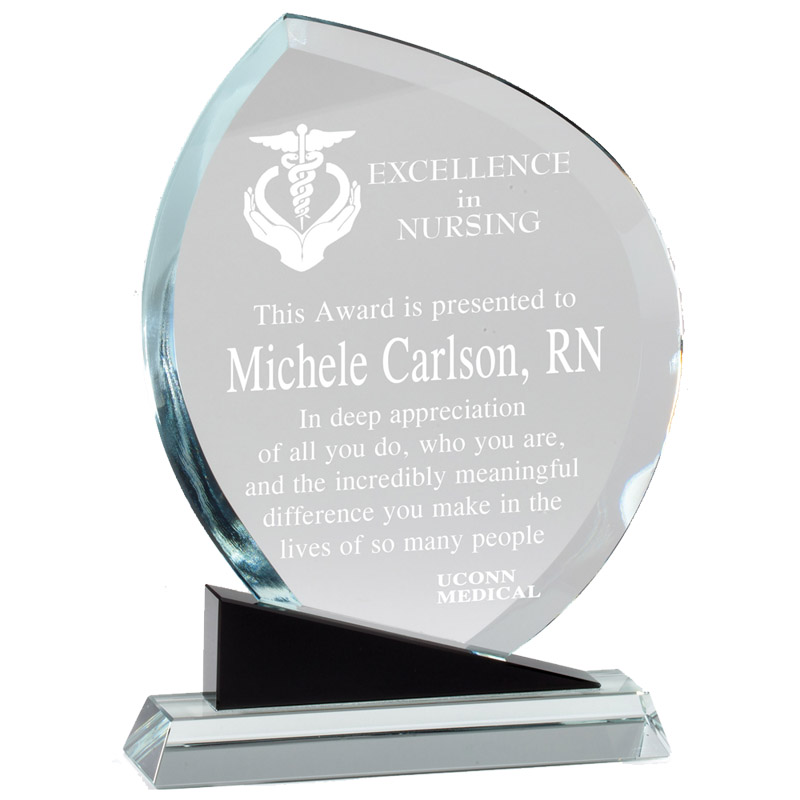 Item Description: 6-1/2 x 8-3/4 inch optical crystal flame shape award on black base with flat area for engraving/personalization. Delivered in deluxe presentation gift case.