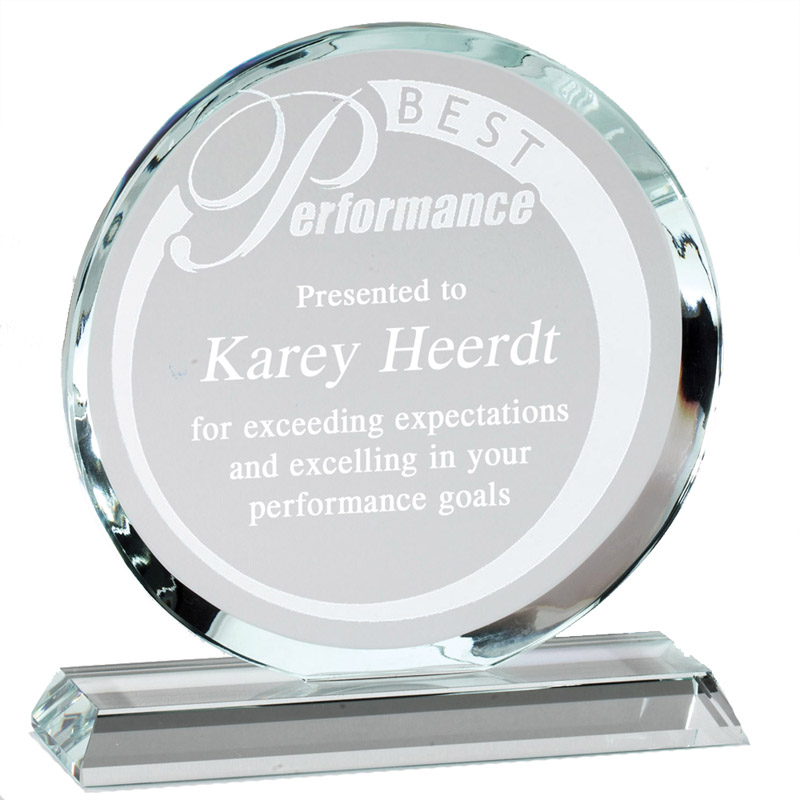Item Description: 5-1/2 x 6 inch optical crystal round shape award with flat area for engraving/personalization. Delivered in deluxe presentation gift case.