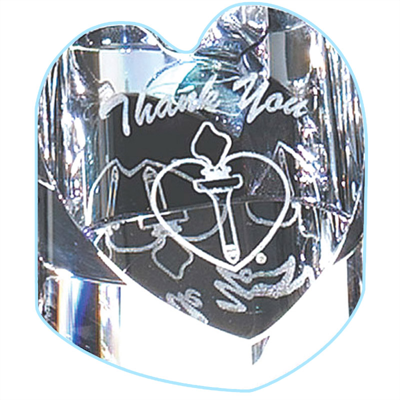 Item Description: 2-3/4 x 2-1/4 Inch optical crystal paper heart shape weight. Can be engraved and delivered in black presentation gift boxed.