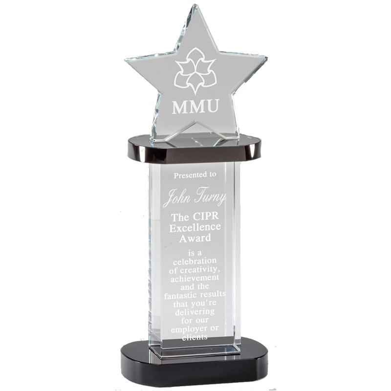 Item Description: 9-1/4 x 3-1/2 Inch optical crystal star tower with black base. Can be engraved and Comes gift boxed.