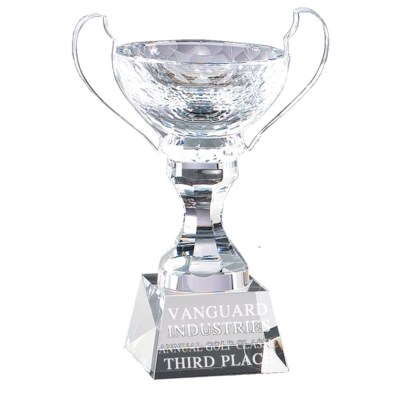 Item Description: 9 x 6-1/4 inch Optical Cut Crystal Elegant trophy cup. Comes with blue velour deluxe presentation box.