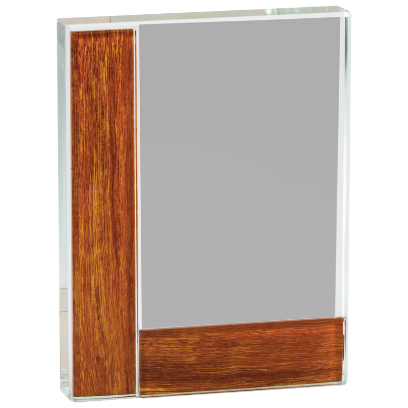 Item Description: 4-1/4 x 5-3/4 inch Rectangular optical crystal award with wood edge two sides stands vertical or horizontal. Comes with deluxe presentation box.