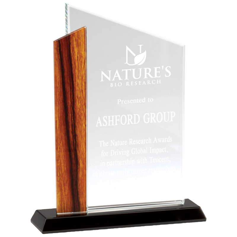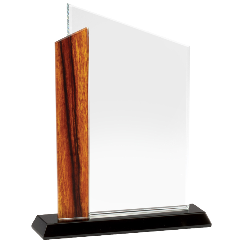 Item Description: Optical crystal award with beveled edges and a wood grain accent on a black base. Dimensions are 6-1/4 (height) x 8 (width) inches. Comes packed in a presentation box.